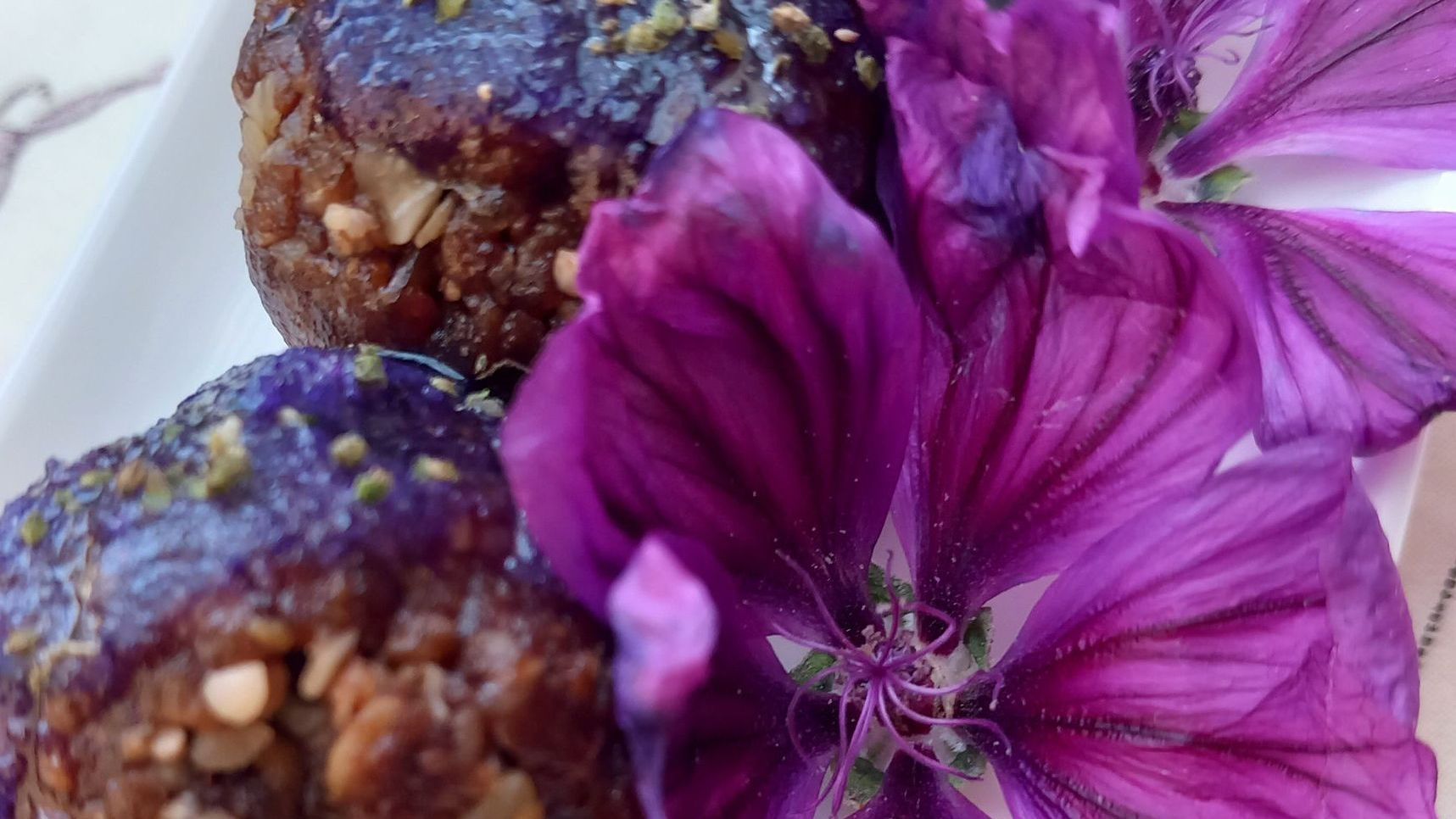 Malvenblüten (nur die lila Blütenblätter, ohne Blütenmitte) mit Zucker in einem Mörser zerstoßen, zaubern eine lila Leckerei.